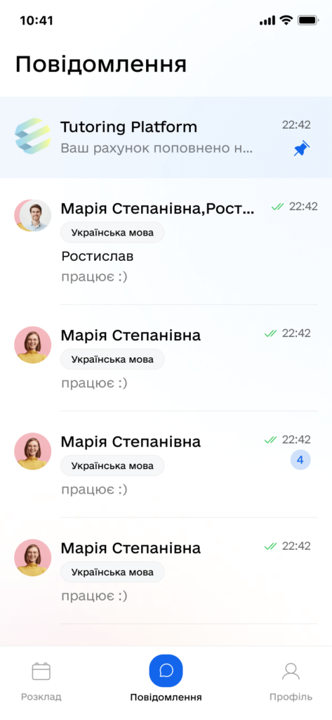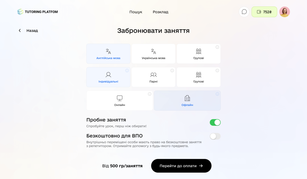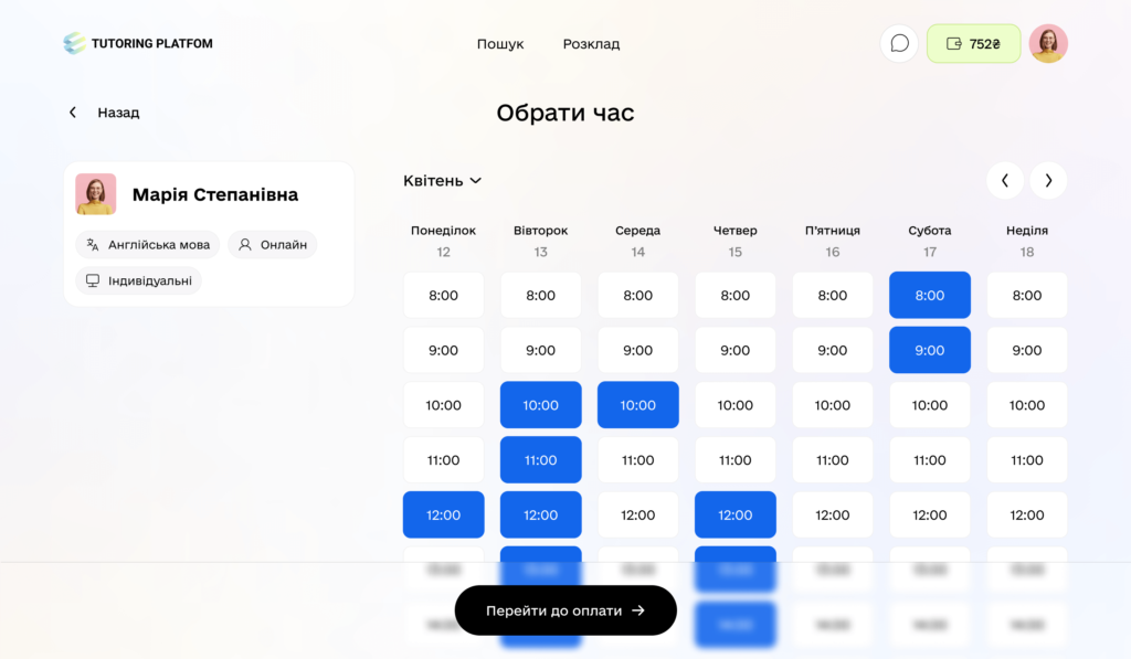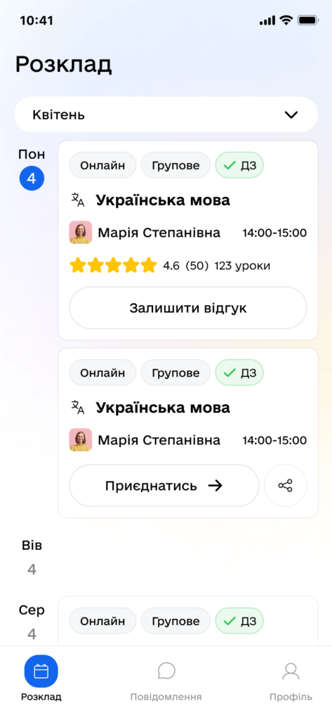 Each tutor indicates the level of teaching, the cost and duration of the lesson, which makes it easy to find the right teacher.