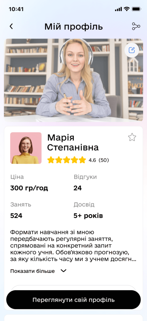 The rating system and comments from students help to choose the best teachers. Tutors’ portfolios allow you to learn more about their competencies, awards and diplomas.